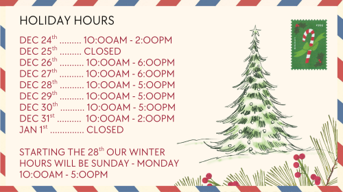 Holiday hours are here! 🎄 Take a look at our schedule, and don’t forget to mark your calendar for our new winter hours starting on the 28th!